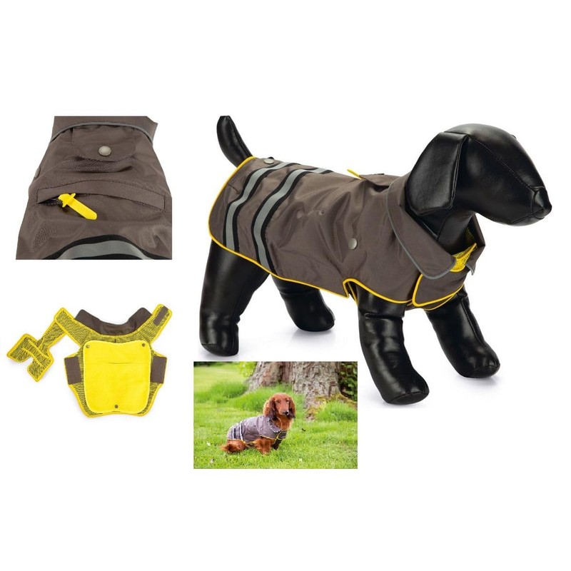 With waterproof PVC coating with reflective strips, Velcro fastener on the bottom, zip for attaching the lead to the collar or harness, with removable soft inner lining made of polyester fleece, washable at 30 degrees.