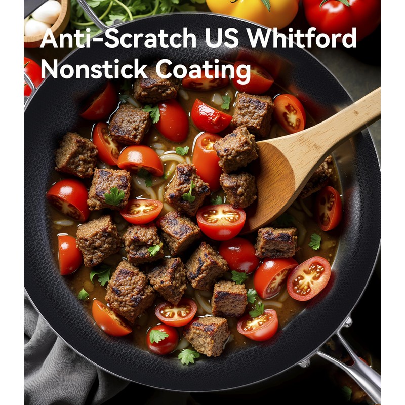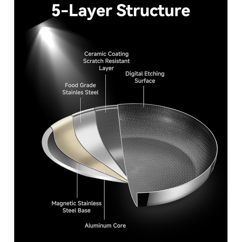 - 【Nonstick Surface】 Our non stick frying pans combine stainless steel with a US Whitford non-stick Coating layer using precision laser etching. This unique design offers superior heat conduction and protection for the non-stick coating. Plus, the coating layer helps food release and glide more easily than a traditional stainless steel pan