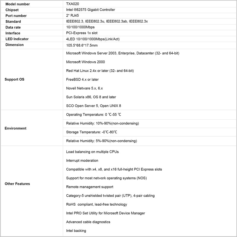 Maximize your network's performance with our cutting-edge Dual-Port PCIe Gigabit Network Card. Crafted for speed and designed for reliability, this network interface card (NIC) is powered by the Intel 82575 chipset and is the perfect upgrade to any system requiring high-bandwidth connectivity. Key Features: Dual Gigabit Ports: Dual RJ45 ports provide up to 1Gbps transmission rates per port, facilitating rapid file transfers, seamless video streaming, and efficient handling of high-traffic networks. Intelligent Offloading: Reduces CPU loading, enhances throughput, and delivers lower latency with advanced features like TCP/UDP checksum offloading and auto-negotiation. PXE Boot Support: Streamline your setup with PXE boot technology, allowing for remote wake-up and installation of operating systems across your network. Broad Compatibility: Seamlessly integrates with a wide range of operating systems including Windows Server, Linux, FreeBSD, and DOS, ensuring versatility for a multitude of IT environments. Low-Profile & Standard Form Factor: Comes with both low-profile and standard brackets, ensuring compatibility with almost any desktop or server case. High-Quality Components: Built with robust materials for reliability and longevity, this card is designed to withstand continuous operation in demanding data center environments. Technical Specifications: Chipset: Intel 82575 Interface: PCI Express x1 Ports: Two RJ45 Ethernet ports Data Rates: 10/100/1000Mbps auto-negotiation Standards: IEEE 802.3, 802.3u, 802.3ab, 802.3x Supported Operating Systems: Windows Server 2003, 2000, Linux, FreeBSD, DOS Dimensions: 105.5mm x 68.6mm x 17.5mm What's in the Box: 1x Dual-Port PCIe Gigabit Network Card 1x Low-Profile Bracket 1x Quick Installation Guide 1x Resource CD with Drivers Whether you're a professional managing a high-demand server environment or a power user in need of a high-speed, reliable network connection, our Dual-Port PCIe Gigabit Network Card is engineered to exceed expectations. Install with ease and enjoy a hassle-free upgrade that will take your network capabilities to the next level. Upgrade your system now and enjoy the lightning-fast, dependable connectivity that our Dual-Port PCIe Gigabit Network Card delivers.