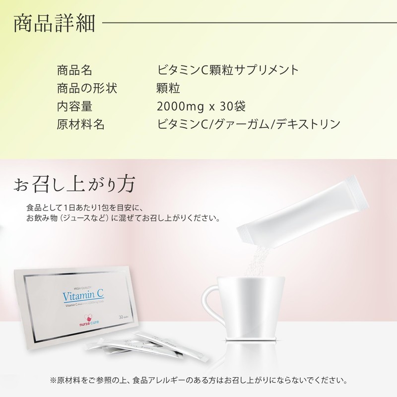 - 【商品詳細】商品名:ビタミンC顆粒サプリメント/内容量:30包 / 1ヶ月分・ 原材料名:ビタミンC、グァーガム、デキストリン