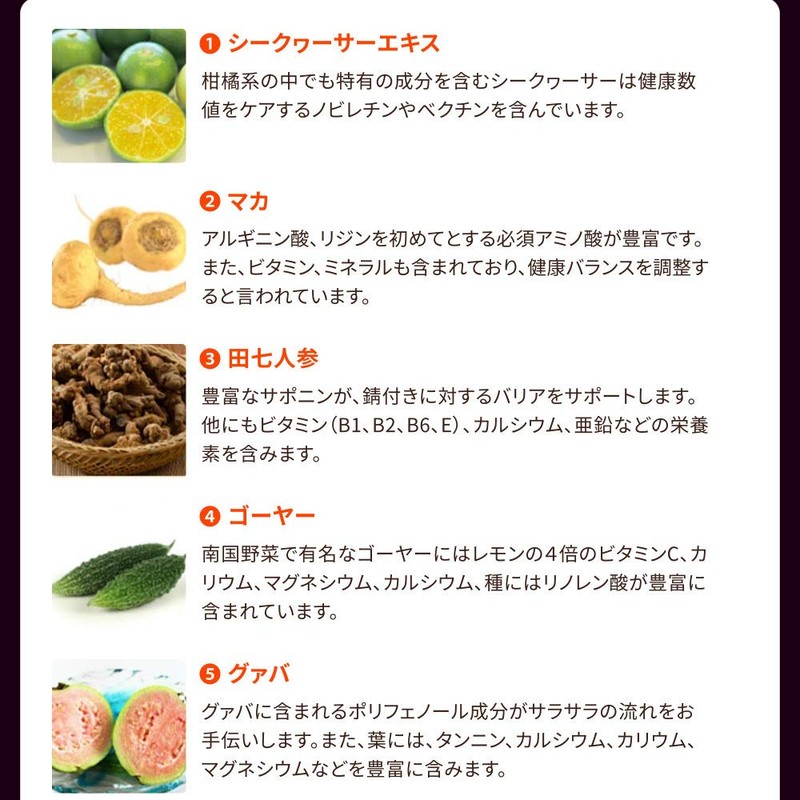 - シークワサーエキス、マカ、田七人参、グァバ、ゴーヤー、秋ウコン、春ウコン、 ガジュツ、コラーゲン、グルコサミン、ドロマイト、イチョウ葉エキス、牡蠣肉エキス、 ビタミンC、霊芝、ギムネマエキス、α-リポ酸、ビタミンB1、ビタミンE、亜鉛酵母
