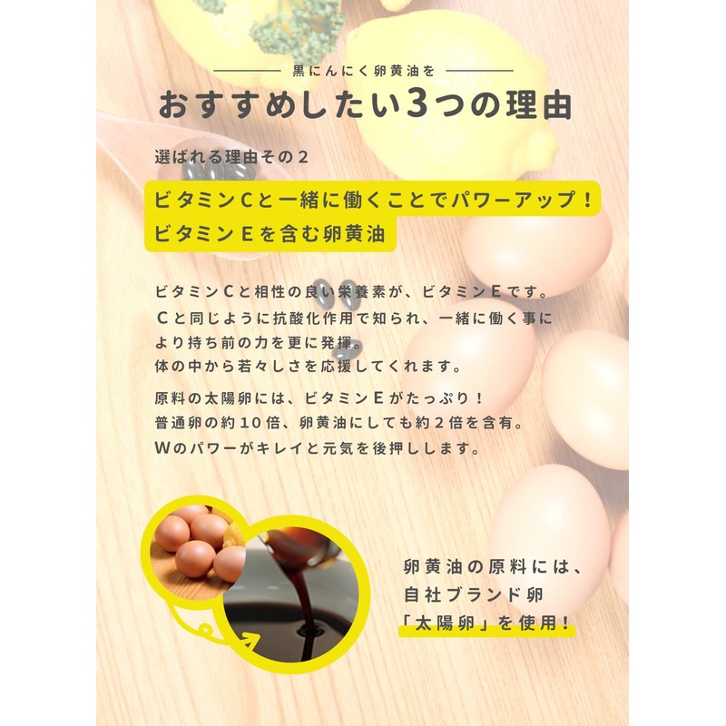 • 長崎の卵屋が、栄養のある卵を皆様にお届けしたいという想いから作った自社ブランド「 太陽卵 」の栄養を凝縮した 卵黄油 と、青森県産の生にんにくを熟成発酵してできた「 黒にんにく 」を合わせた黒にんにく卵黄油サプリメントです。毎日飲んでほしいものだからこそ、皆さまの健康を第一に考え、愛飲後の実感を重視しました。材料は、卵黄油と黒にんにく、カプセルを作るための素材のみと、安心して続けられるサプリメントにこだわって作っています。1か月は試してみたい方、自分のペースで続けていきたい方におすすめです。