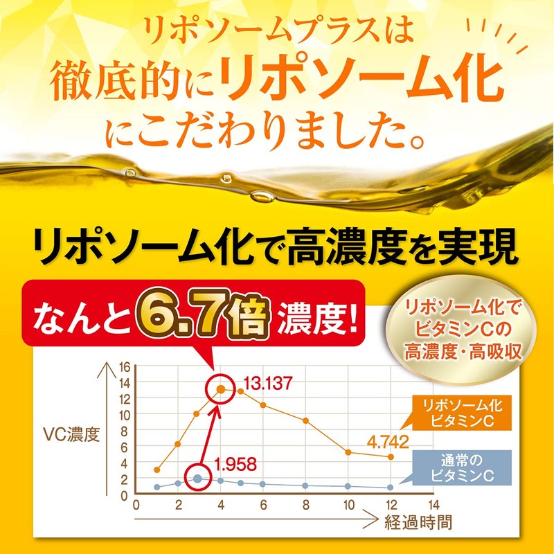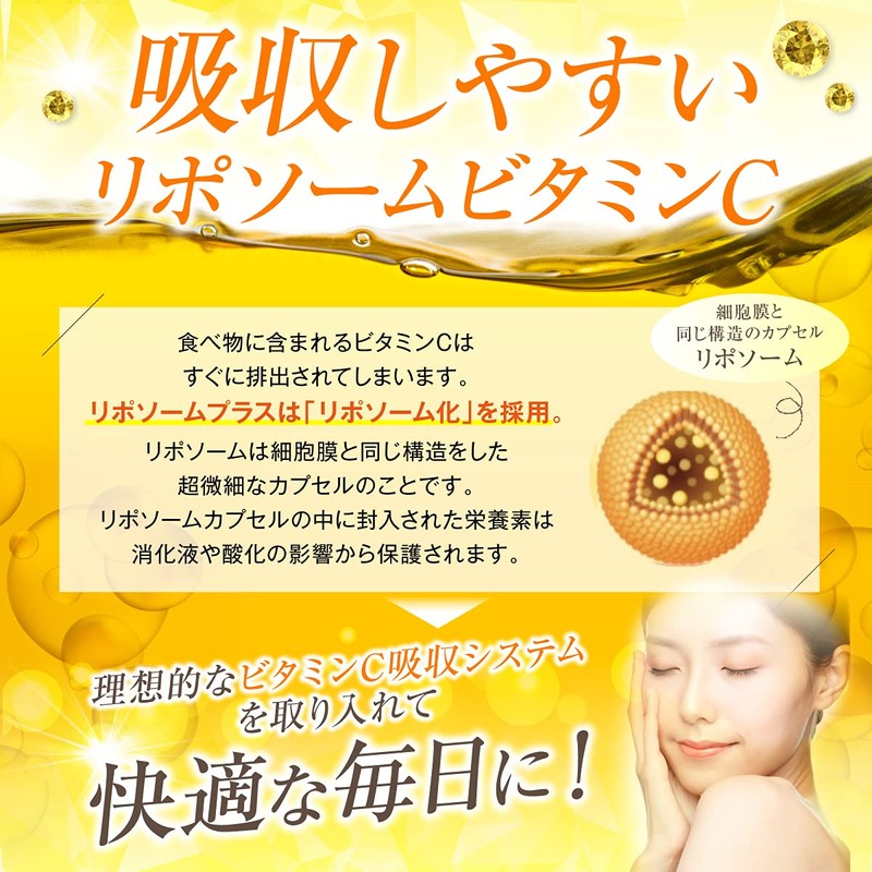 - ✅【リポソームビタミンCとは】ビタミンCをリン脂質でくるむことで、胃酸などの消化器官の影響をうけることなく、腸へとどけ、腸からビタミンCを血中に届けることができるリポソーム化(とどける)されたビタミンCです。消化器官の影響をうけず、血中にビタミンCをとりこむことにより、ビタミンCの効果を最大限に発揮させることができます!