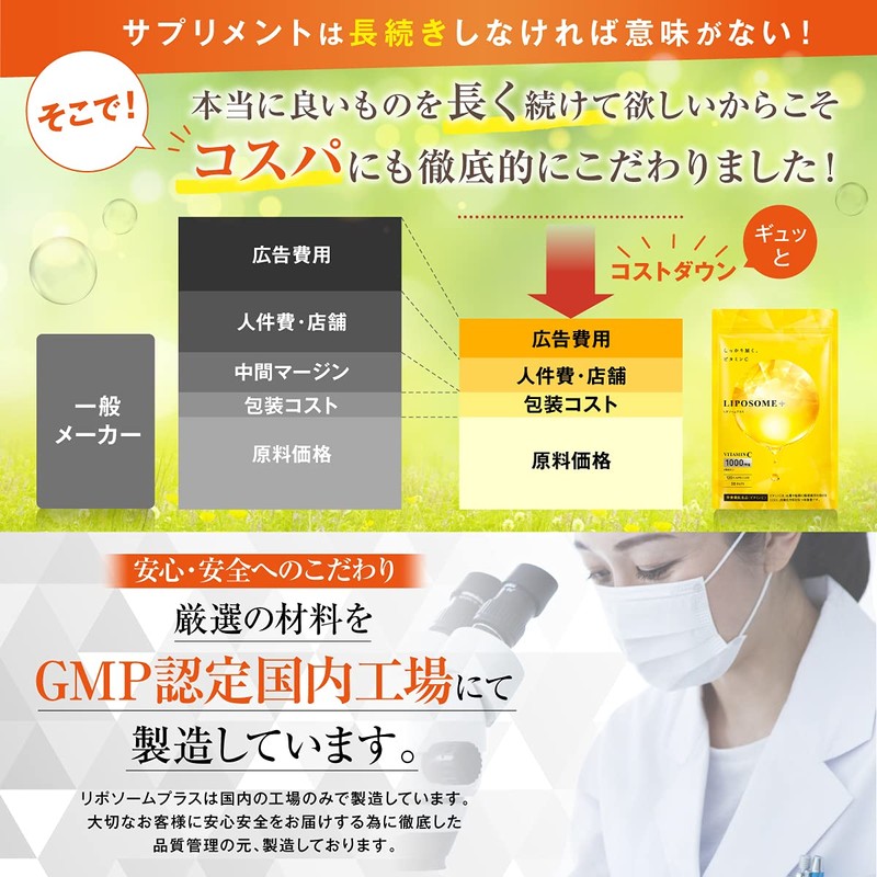 - ✅【 品質が確保された国内のGMP認定工場で製造 】 GMP認定工場とは、製造、品質、衛生について専門性を有する第三者の外部機関による厳密なチェックを受けている健康補助食品GMPに認定された工場のことです。原材料の入荷から製造、最終製品の出荷に至る全ての過程において「一定の品質」が保たれていると認可を受けた工場のみがGMPを取得できます。リポソームプラスはGMP認定の日本工場でつくられています。