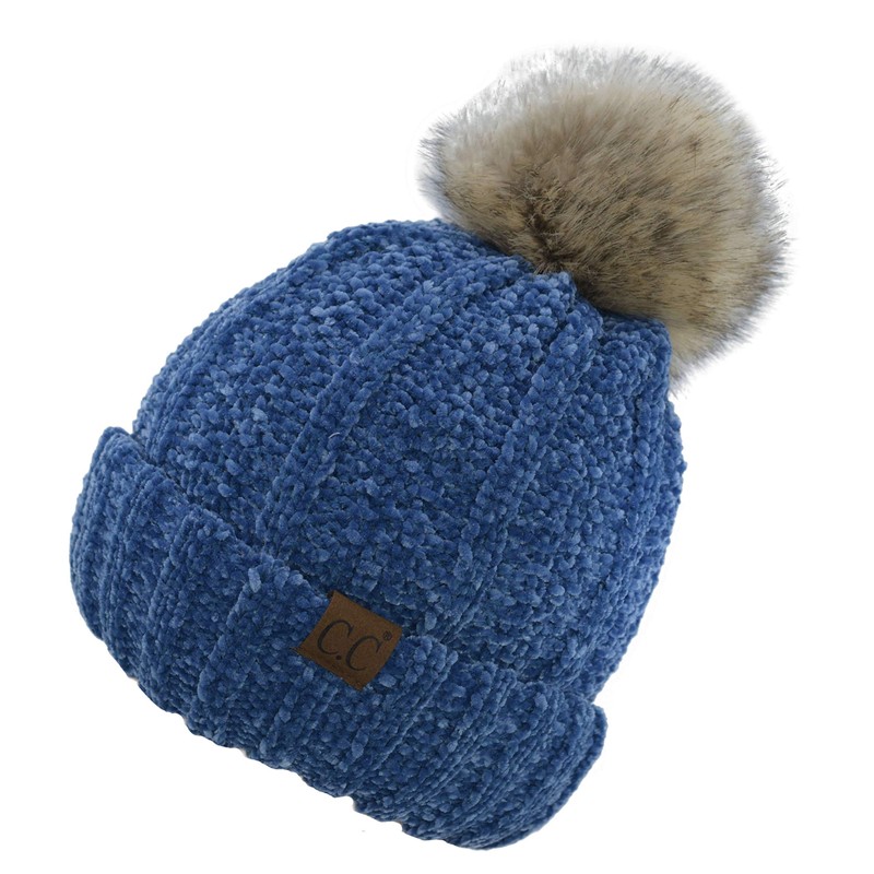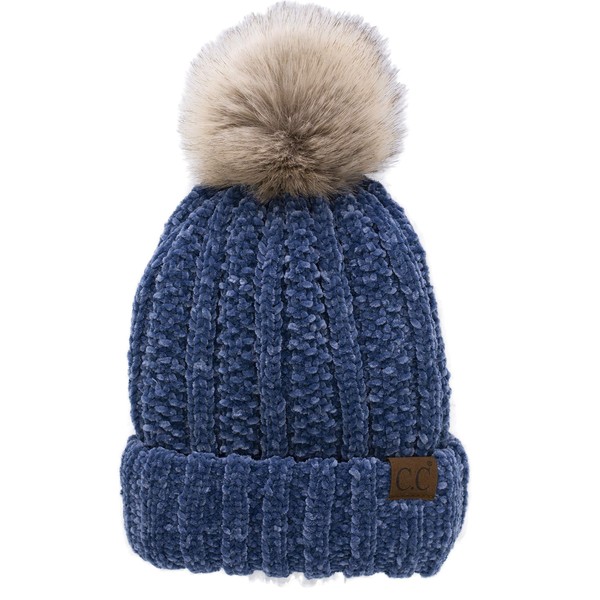 C.C Gorro grueso de punto trenzado de pelo sintético mullido con forro polar, Denim oscuro de chenilla, Talla única