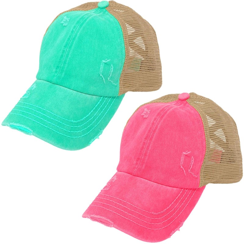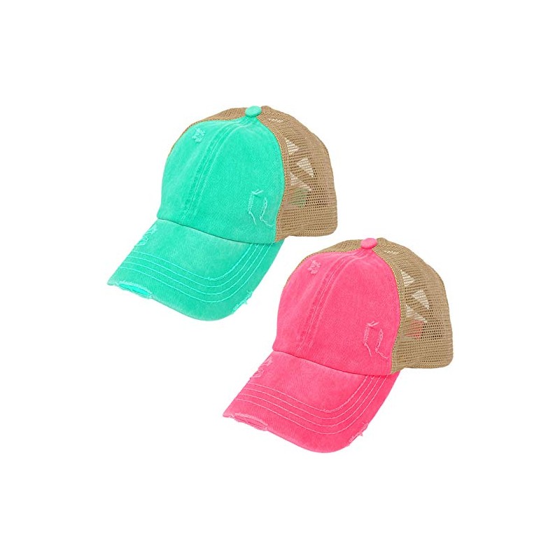 C.C Ponytail Criss Cross Messy Buns Ponycaps Baseball Cap Dad Trucker Mesh Hat (1 Distressed Mint + 1 Distressed Pink)
