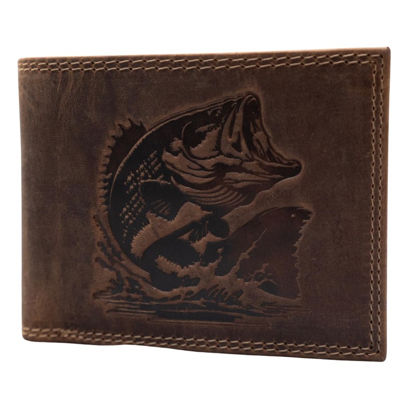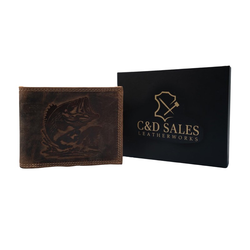 C&D SALES RFID-Protected Bifold Wallet for Men - Full-Grain Hunter Leather, Laser-Engraved Fish Design, 15 Card Slots, 2 Note Compartments with Suede Lining, 1 ID Window
