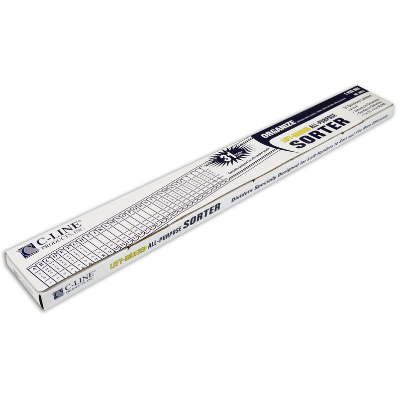 This durable plastic sorter is specifically designed for left-handers, so that you can sort and file more efficiently. Organize and group documents with one dimension of 9 1/2 inches or less. Conveniently stores in a standard desk drawer. Dividers are labeled from A to Z, January to December, Sunday to Saturday, 1 to 31 and 0 to 30,000. Quantity: 1 Sorter.