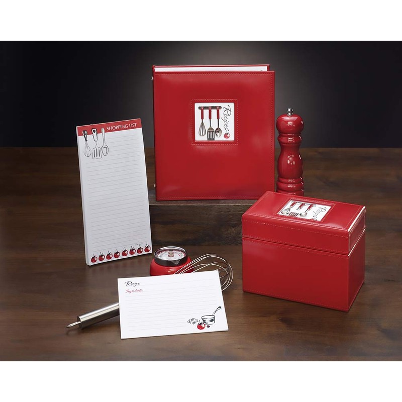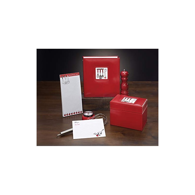- Red bonded leather cover with topstitching and a die-cut window that frames miniature hanging utensils with a bright, stainless finish
