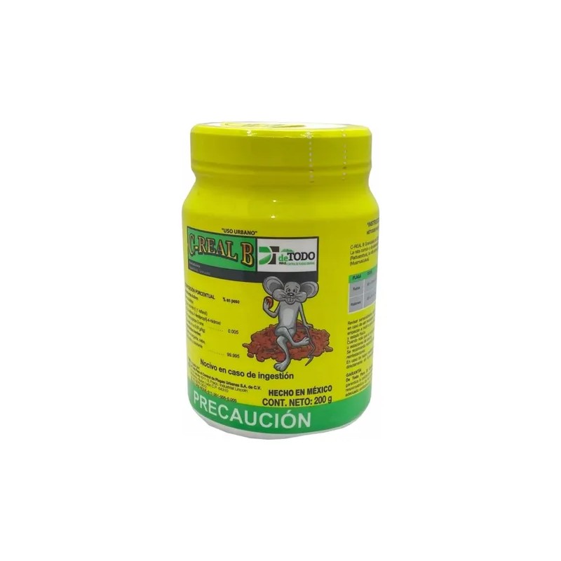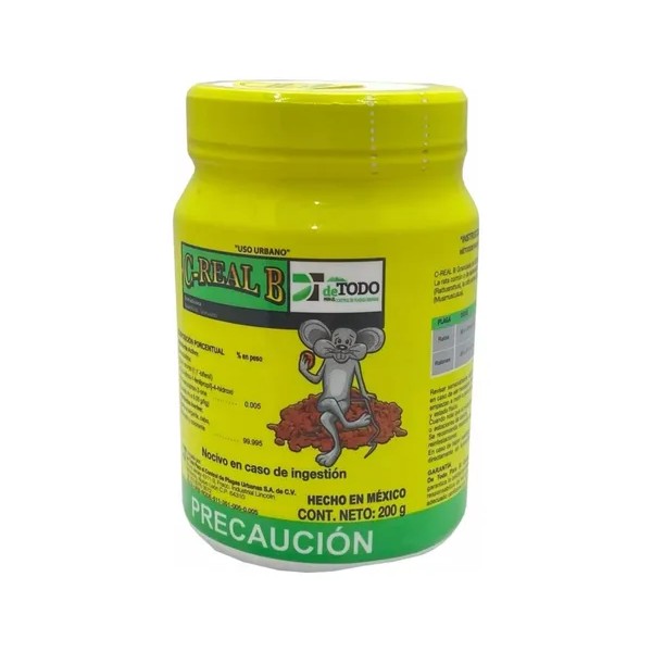 C-Real B Granulado es un raticida anticuagulante de segunda generación en base a bromadiolona fabricado granos seleccionados por su palatabilidad con los roedores, los cuales se impregnan del Ingrediente Activo en forma de polvo rojo totalmente sin aportar ningún olor o sabor al producto final, por lo cual el roedor no dudará en consumirlo.