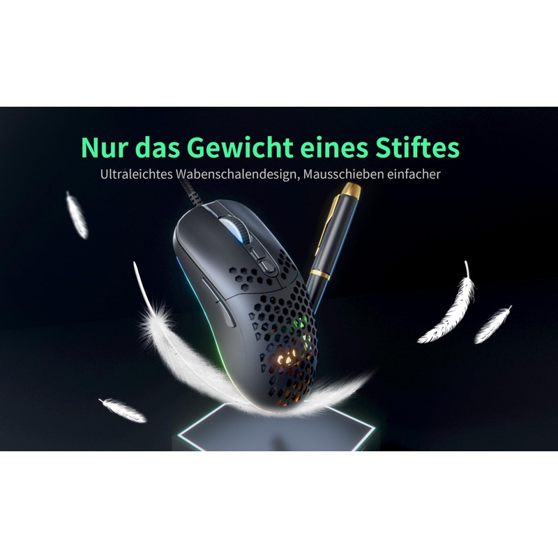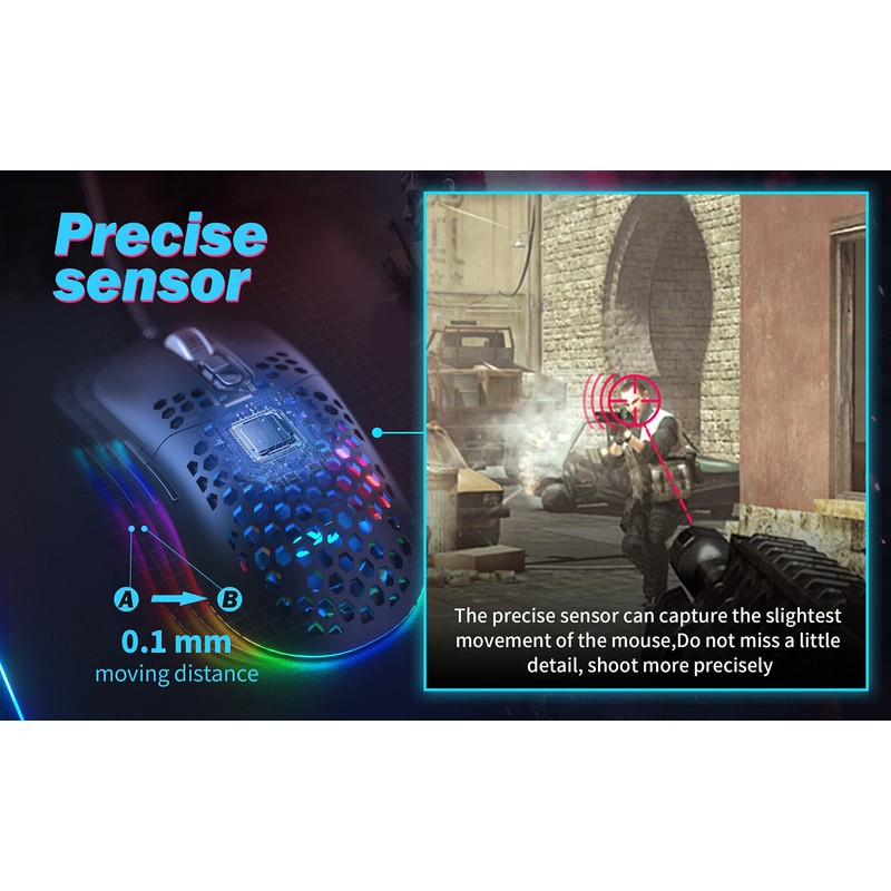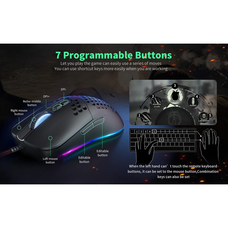 - 【Comfortable Grip Honeycomb Gaming Mouse】More breathable, more sweat-absorbent and more comfortable! The gaming mouse ergonomic design fits all hands and grip styles, keep your hand comfortable even after long hours of use. Mouse gaming honeycomb design reduces the weight and make the mouse more flexible and easier to be used for a long time without fatigue, and also enhance the heat dissipation features, very comfortable to use.