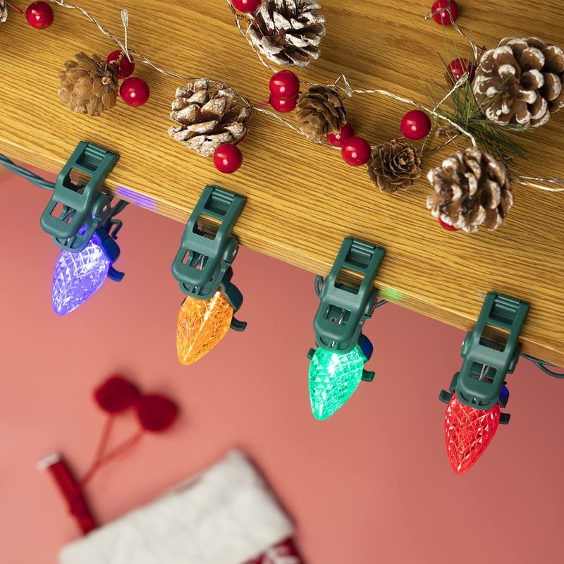 - Set of 25 C9 Quick Lights Clips: 25 pieces green outdoor lights spring clips per package, really enough for entire house, water leaking designed, accommodate with E12, E17 base and other mini lights string