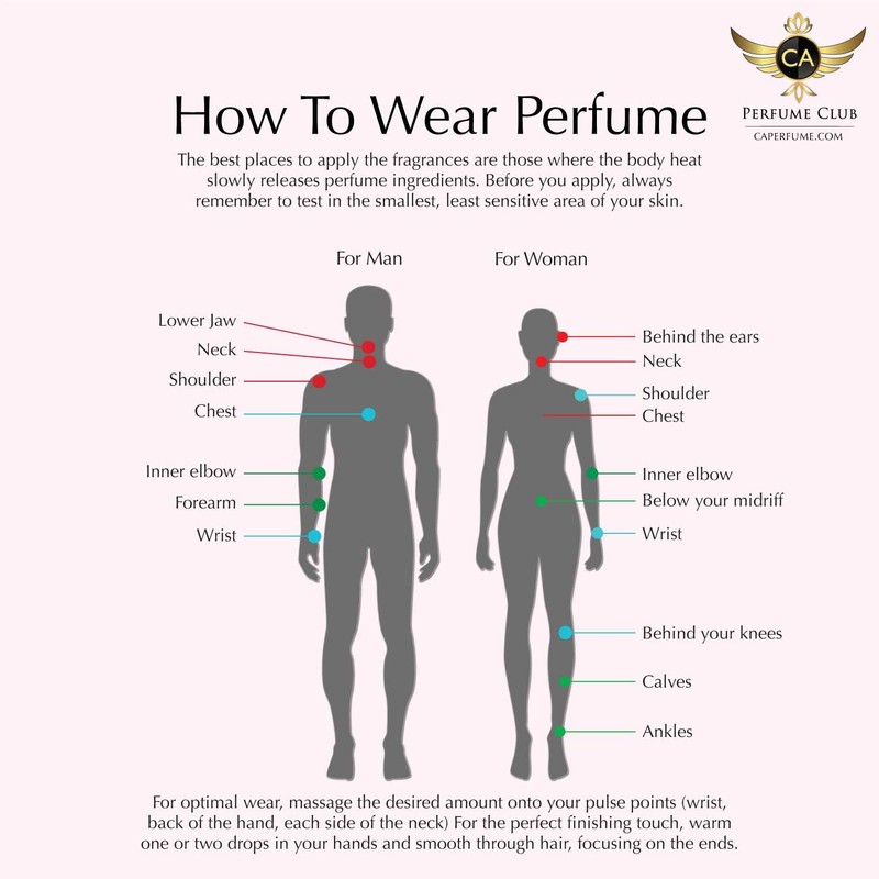 The best places to apply perfume is those where the body heat slowly releases perfume ingredients. Before you apply, always remember to test in the smallest, least sensitive area of your skin first.