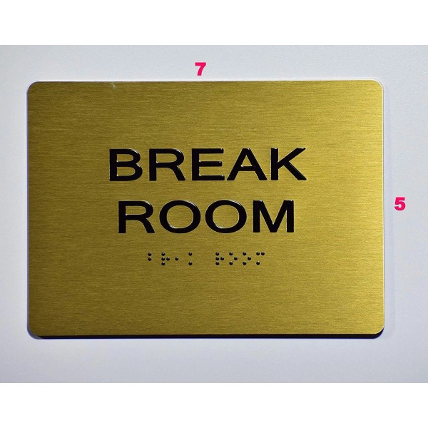 BREAK ROOM SIGN .SIZE: 5X7 Inch color letter: BLACK. Color background: GOLD. Come with two sided tape. This is a HIGH QUALITY Aluminium sign !!! This is not acrylic sign (Plastic sign).This is a Braille sign with RAISED tactile Graphics and Letters. Sign is shipped ready-to-install with double sided tape. A picture is worth a thousand words- see our images Notice: Color of the SIGN can be look different base on the lighting around it ( Darker GOLD or light GOLD base on light surrounding it)