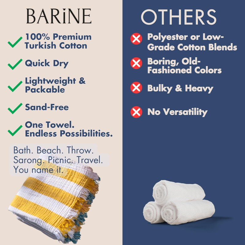 - MEDITERRANEAN TURKISH BEACH TOWEL - Made from 100% long-staple turkish cotton, this soft and lightweight Barine cotton beach towel features a smoother, stronger yarn. Sourcing raw material domestically also lowers the carbon footprint.