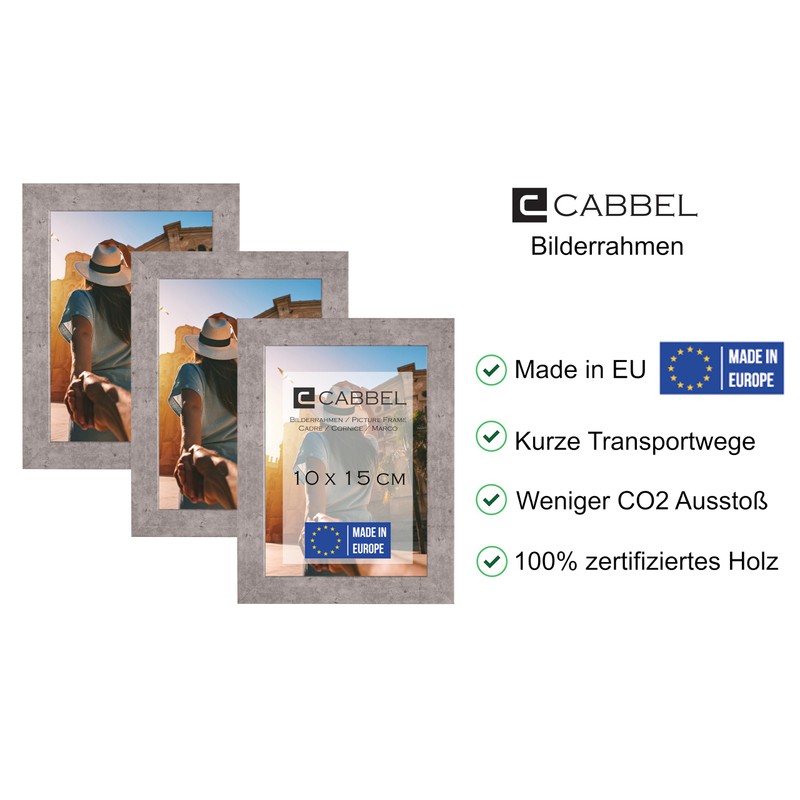 CABBEL Set of 3 Picture Frames 10 x 15 cm, Grey/Concrete, Sturdy MDF Wood Frame, Shatterproof Plexiglass, for Hanging and Setting Up, Ideal for Photos/Pictures/Collages