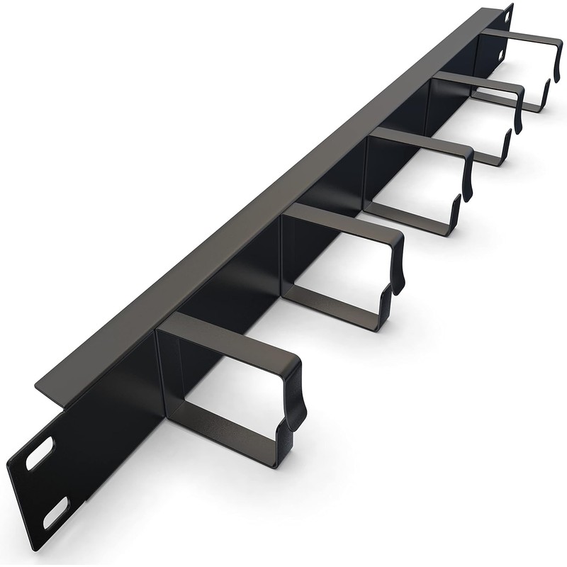 This cable management panel will organize all of the chaotic cords that make your network rack look messy and unprofessional. It only takes up 1U of your 19 in rack, and the cord organizer's 5 rings will enable you to sort your cables in 5 distinct groups. The cable panel will fit easily on any standard industrial rack, and the installation requires minimal time and no tools. The design of the cable manager is simple yet durable, made of thick cold-rolled steel with an elegant black finish.