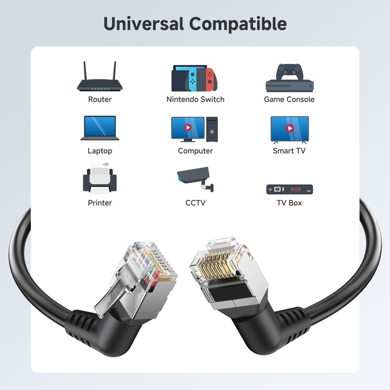 - Future-Proofed for Next-Gen Networking: Ideal for professional and home use, this right-angle Cat 8 cable supports future-proofed networking needs, ensuring compatibility with the latest Ethernet standards and devices for optimal network performance.