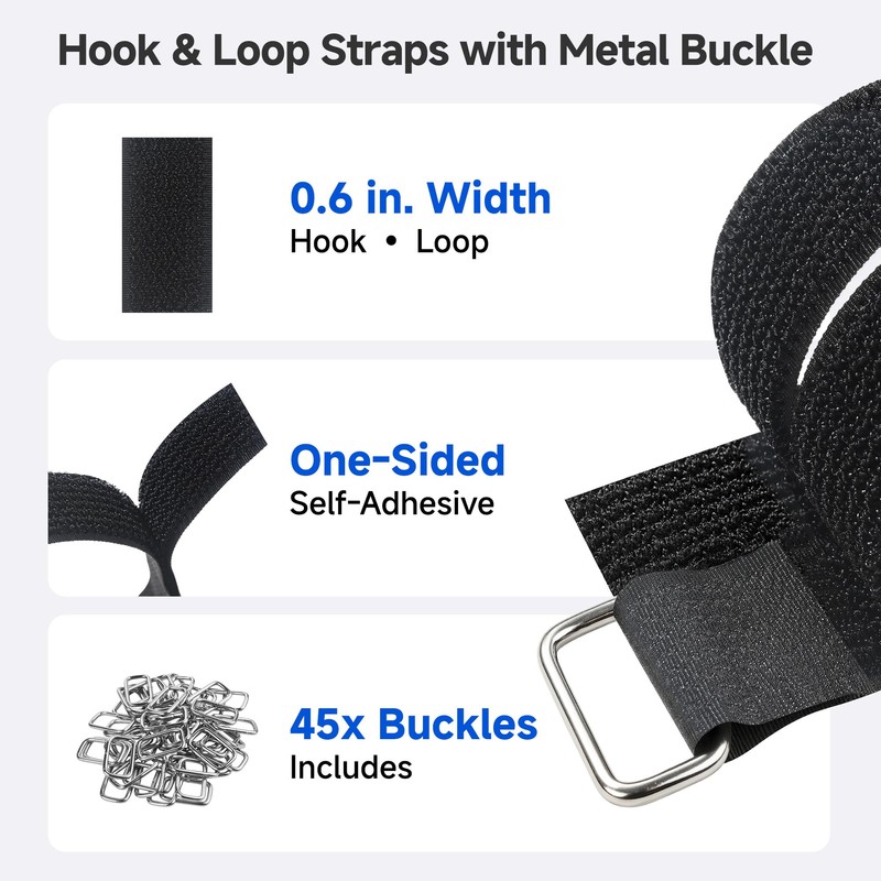 - Secure Metal Buckle Fastening: Includes 45 durable metal buckles to convert each cut piece into strong, adjustable hook and loop tie straps for a secure and reliable hold.