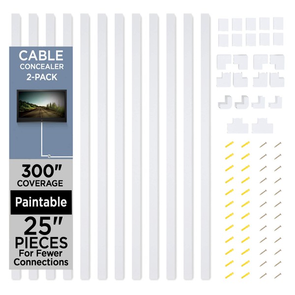 - COMPLETE CABLE MANAGEMENT KIT The Cable Concealer is the perfect cord organizer It contains everything you need to organize those messy cables Each kit contains 12 cable cover raceways 1 1/8" x 11/16" x 25" each That is 300" of cable concealment!