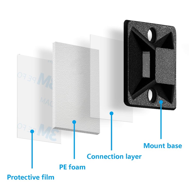 Just peel off the backing paper and place firmly on a clean and smooth surface for best adhesion, then get the zip tie through the hole, locking teeth in the head and secure cables with zip tie.