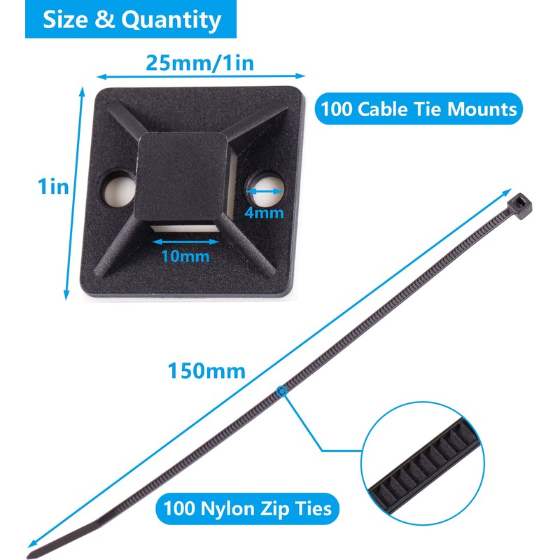 • 【Package Contains】100 pack 1 inch cable tie mounts and 100pcs 6 inch nylon zip ties.