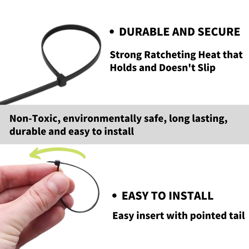 • ✔️ HEAVY-DUTY & EASY TO USE - The Plastic zip ties are made of high-quality Nylon material, holding up to 50 pounds (22.5KG) tensile strength. Binding the item you would like to sort out, put the warp wire into the head, then lock the plastic ties teeth to stop at your desired length.