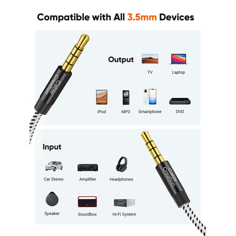 - 1/8” TRRS Aux to Aux Cable: CableCreation long 3.5mm audio cord with 4-pole design not only supports audio output but also supports microphone function. Great for voice chat in games, video chat, online conference, live broadcast, listening to music and singing
