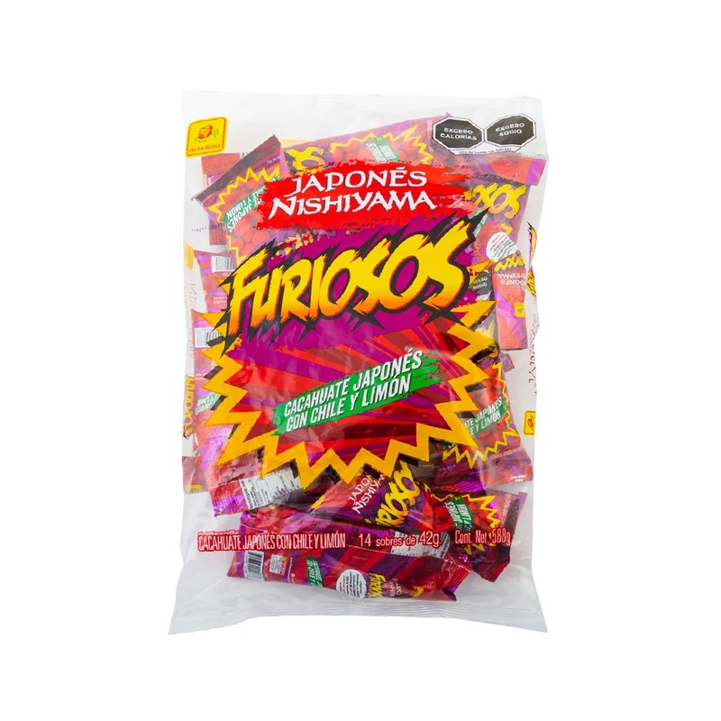 Cacahuates Furiosos Nishiyama - Cacahuates Mexicanos picantes con Limon y Chile - Bolsa con 14 piezas 42gr