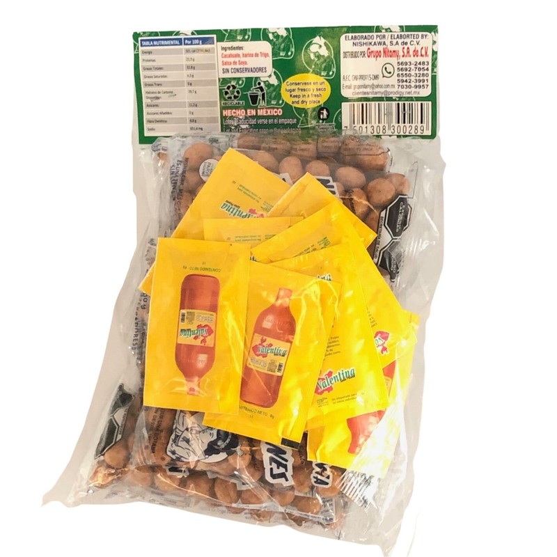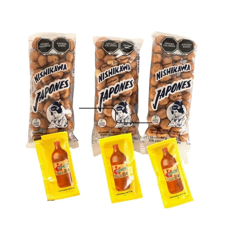 - Esta presentación viene acompañada por 10 sobres de la deliciosa y tradicional salsa Valentina para hacer de los cacahuates japoneses Nishikawa la mejor botana para cualquier momento.