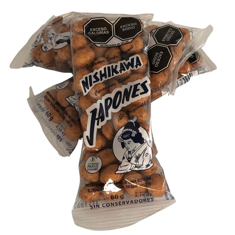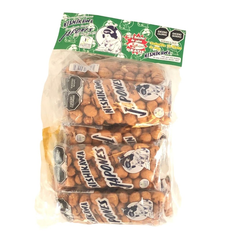 - 10 bolsitas de 60 gramos de cacahuates estilo japonés Nishikawa los tradicionales. El auténtico cacahuate japonés que te acompaña desde hace 70 años.