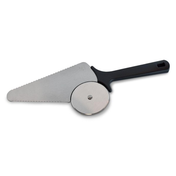 Once your pizza is hot off of the barbecue, make slicing and sharing easy with this 2-in-1 Pizza Slicer. High grade stainless steel with large wheel to easily slice through thick and thin crusts. The large slice server makes it easy to lift and share pizza slices, without making a mess of your perfectly cooked pizza. The 2-in-1 Pizza Slicer has a comfortable non-slip handle.