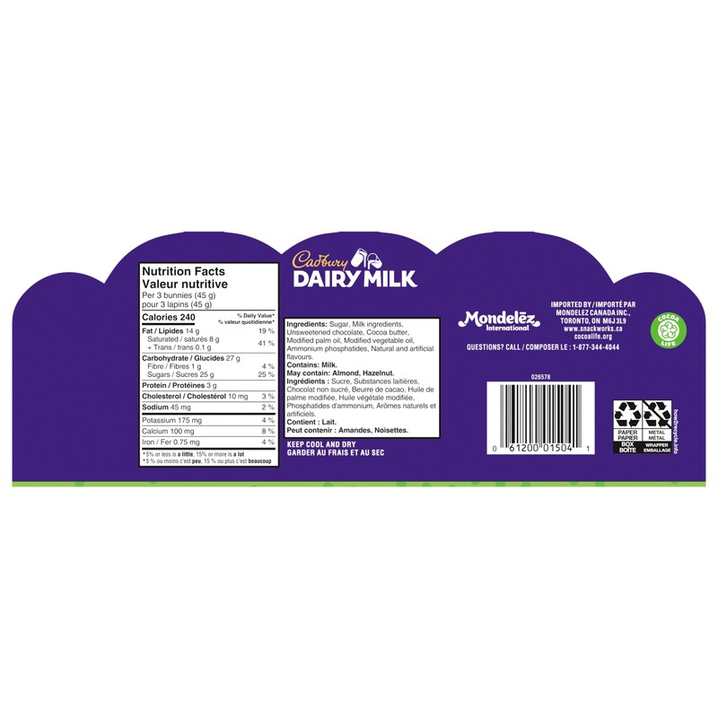 - Make Easter even sweeter with Cadbury Dairy Milk. Each 15 g Easter bunny is 80 calories