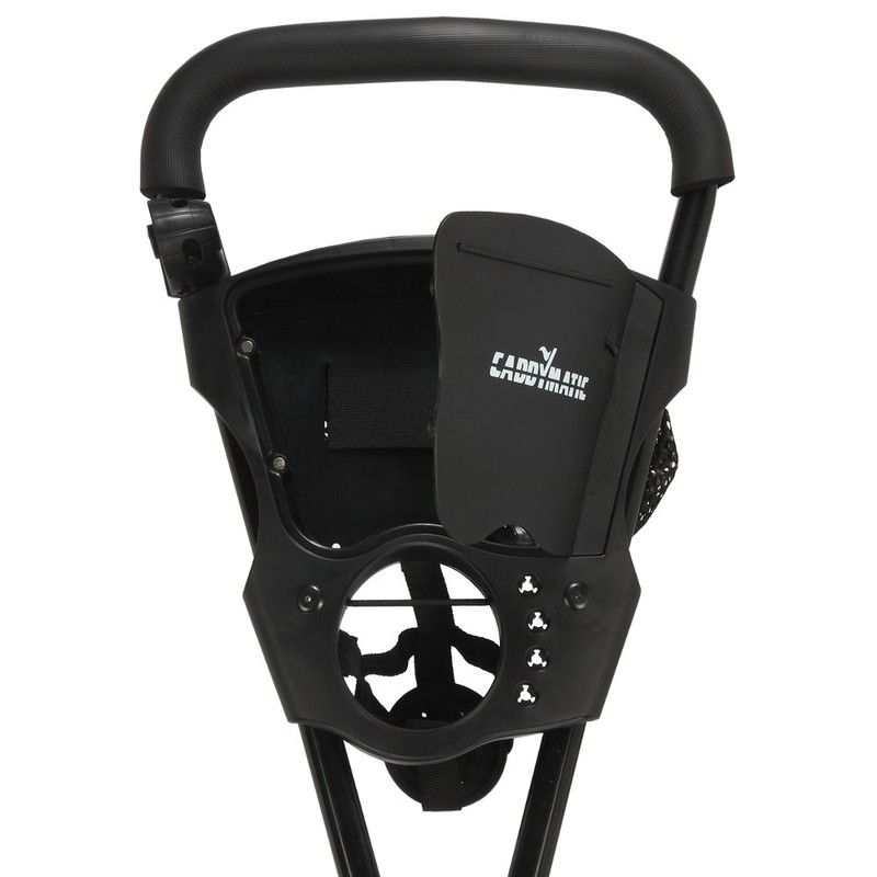 - The cart's handle includes a drinks holder, scorecard holder and storage pouch, as well as tee holes - all the essential features you need.