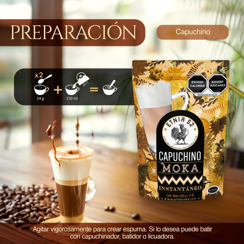 CARACTERÍSTICAS EXCLUSIVAS | Café Capuchino Instantáneo ETNIA 52, 100% mexicano y con certificación Kosher. Disfruta de 500g de un capuchino espumoso y cremoso, libre de gluten y listo para preparar en segundos.