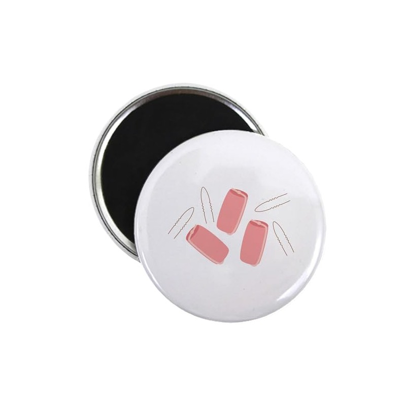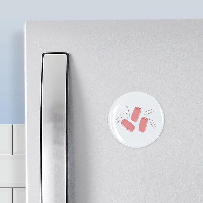 - Round refrigerator magnets printed on the metal shell with a flat, magnetic backing