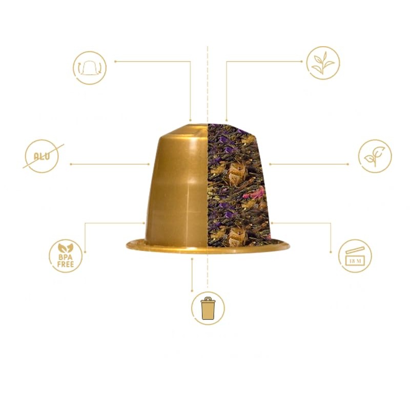 • Broken down and packaged in convenient compatible and compostable capsules. Te@Espresso capsules are made for all herbal drink lovers who want to reduce their impact on the environment.
