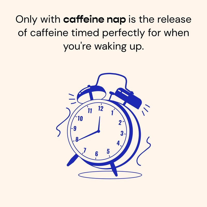 - PERFECTLY TIMED RELEASE: Many people enjoy the benefits of a “coffee nap” by drinking a cup of coffee and then trying to fall asleep. But the uptake of caffeine from coffee is too fast – it doesn’t allow enough time to fall asleep and have a sufficiently long nap. That’s why we formulated Caffeine Nap.