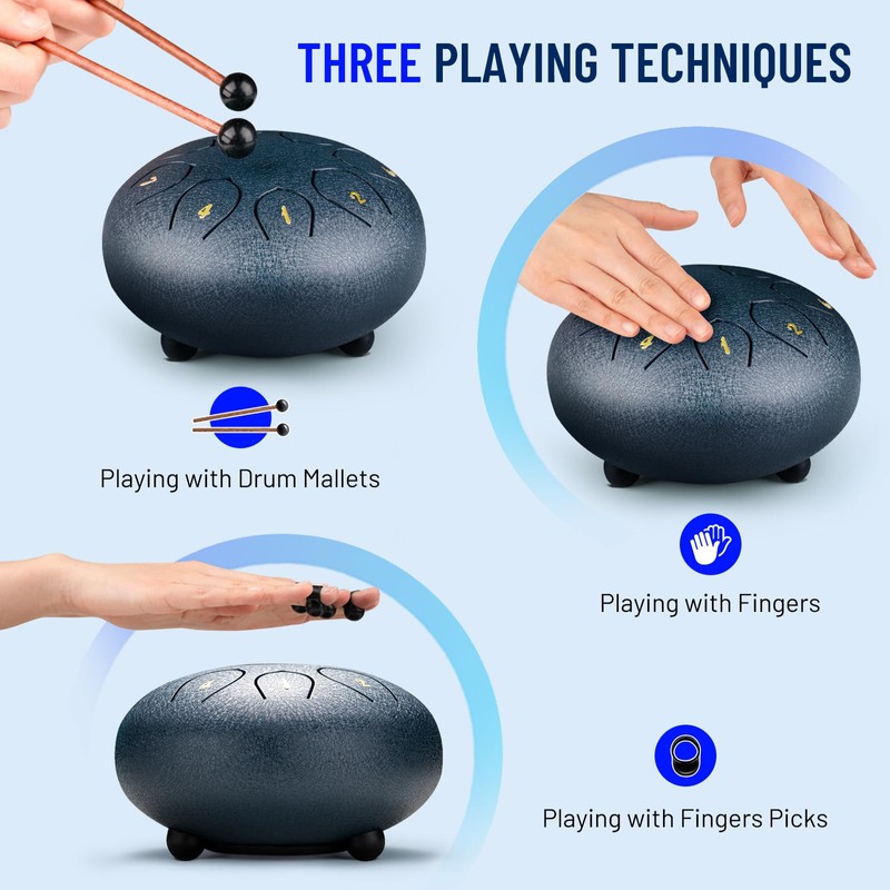 - Complete Steel Drum Set: Tongue drum*1, storage bag*1,songbook*1,mallets*2,drumstick holder *1,cleaning cloth *1,finger picks *4,stickers *1.Even beginners can play it easily
