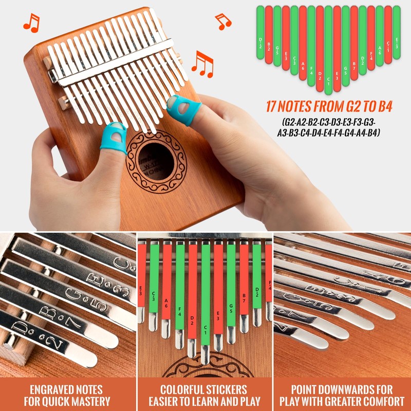 - BEGINNER-FRIENDLY SET: This package includes a tuning hammer, sheet music, finger protectors, scale stickers, a carrying bag, and a cleaning cloth. It provides all the necessary items for beginners to easily play and enjoy relaxing music. The professionally designed sheet music provides detailed instructions on how to play the Kalimba, allowing even those without musical background to play effortlessly using only their thumbs.