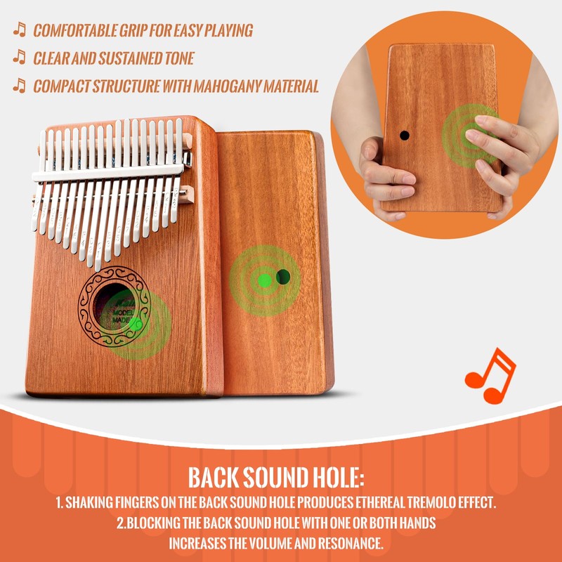 - HIGH QUALITY MATERIAL: This Kalimba is made of high-quality mahogany material and features excellent mineral metal. It is crafted from naturally air-dried wood, which enhances the durability of the Kalimba keys and increases the overall grade of the instrument. With an ergonomic design, it naturally fits in your hand. The keys are engraved with musical notes, providing comfort even during long hours of play.