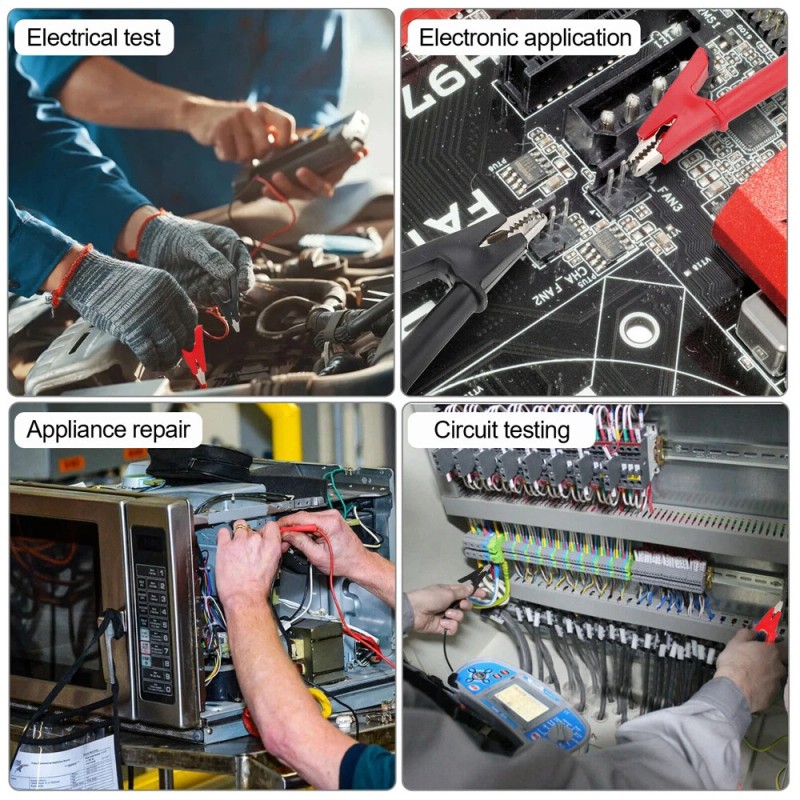 • Easily distinguishable with two color-coded jumper wires, preventing tangles during testing. The flame-retardant PVC shell adds a layer of security, offering a soft, comfortable grip and improving overall work efficiency.