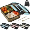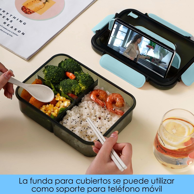 Caja de Almueo y Bolsa de Almuerzo, Fiambreras con 3 Compartimentos, 1500ml de Gran Capacidad con Cubiertos, Portátil y Sellada, Apto para Microondas, Congelador y Lavavajillas (Azul)