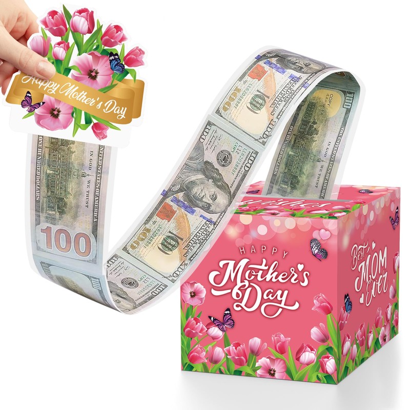 - Caja de regalo sorpresa con rollo de dinero: ¿Quieres un regalo especial de cumpleaños para tu mamá? Esta caja de regalo de tulipán rosa puede contener tus sorpresas, simplemente tira de la tarjeta y salen todos los regalos en efectivo. No es solo un momento simple, sino también una forma divertida y amorosa de dar dinero en efectivo como regalo del Día de la Madre.