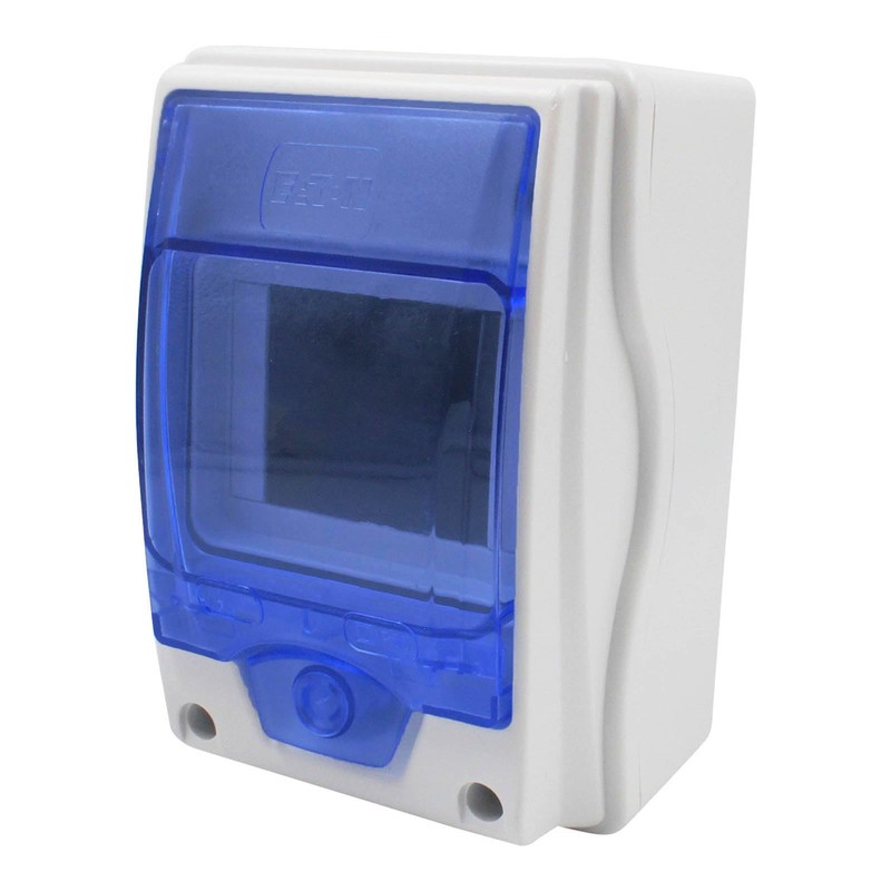 Caja de distribución de 4 módulos IP65 EATON ROYER, WD6504, 4 pastillas riel DIN, diseño moderno. Para disyuntores-interruptores termomagnéticos de montaje en riel DIN. Medidas 10 x 15.5 x 9 cm