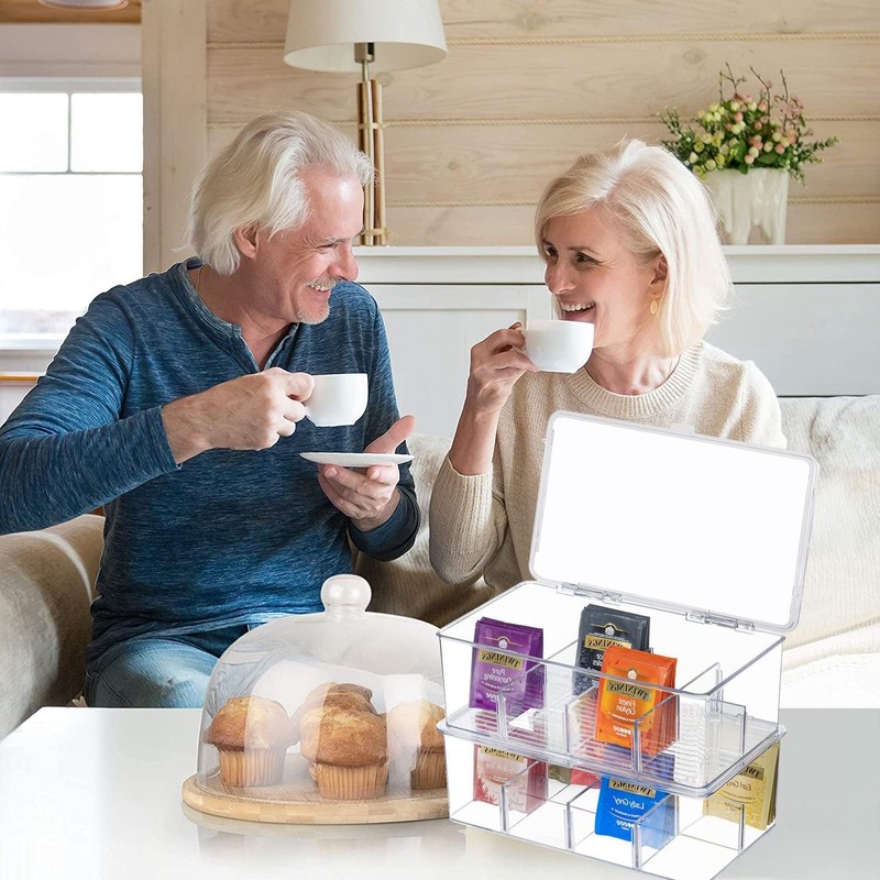 Caja para Té con 8 Compartimentos, LETTURE Organizador Caja para Bolsas de Té con Tapa Abatible para Proteger el Contenido, Caja de Plástico para Té, Café, Especias, para Despensa, Nevera, Cocina