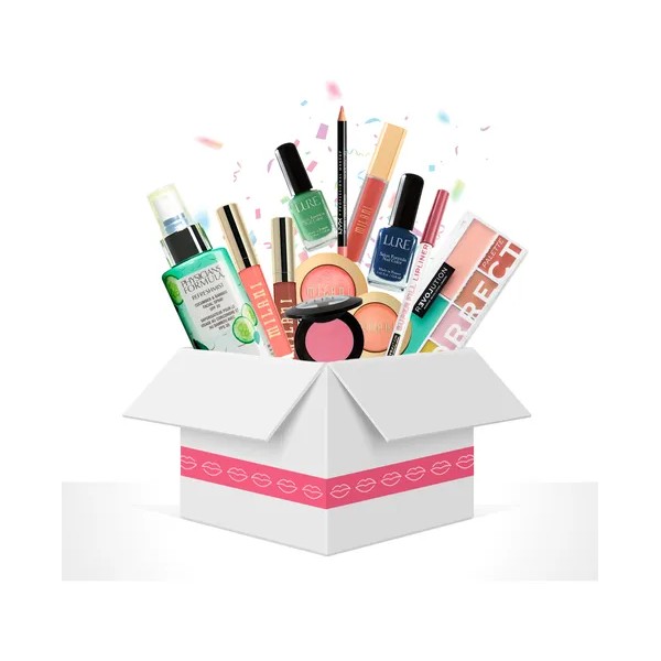 Caja sorpresa ideal para ventas a mayoreo. Incluye más de 35 productos entre cosméticos y accesorios.