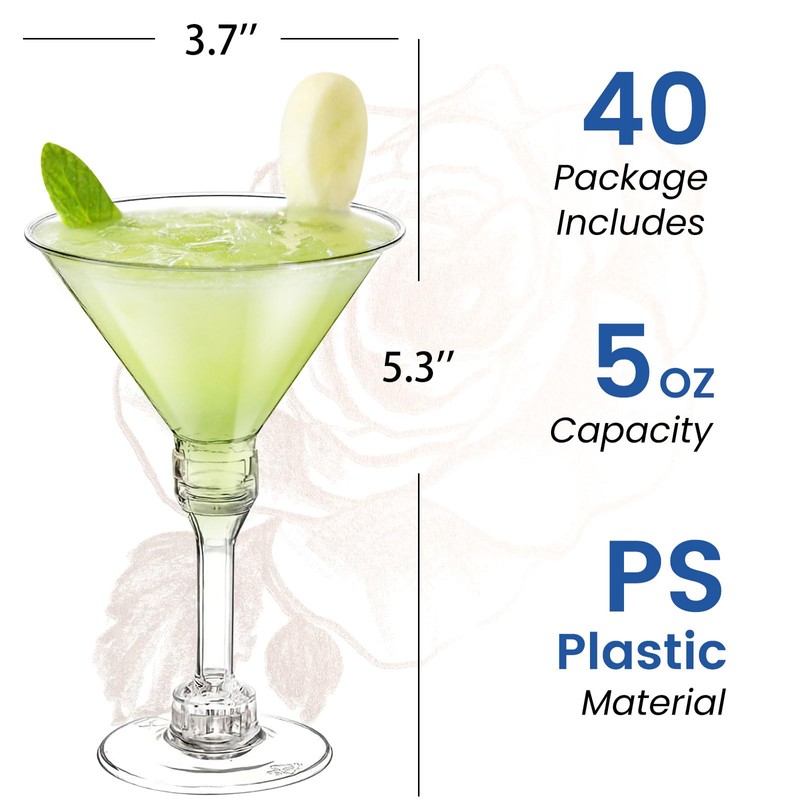 - ENTERAIN IN STYLE: Impress your guests with this set of 40 disposable martini glasses perfect for wine. Suitable for any occasion, these cups are a practical and stylish way to serve your favorite treats.The cocktail glass consists of three parts, the base, the stem and the body, which are easy to install and tightly linked so that you don't have to worry about it during the party.