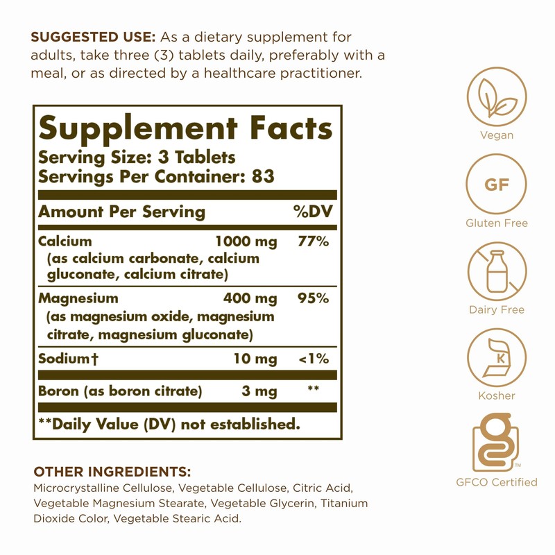 Solgar Calcium Magnesium Plus Boron - 250 Tablets, Pack of 3 - Non-GMO, Vegan, Gluten Free, Dairy Free, Kosher - 249 Total Servings