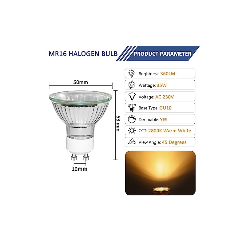 - MR16 230V Spotlight35W dimmable MR16 GU10 halogen lamp. GU10 Bi-Pin Socket MR16 Standard Shape; 360 lumens, ?50*53MM, input voltage 230V. Before purchasing, please check carefully whether the voltage and dimension match.